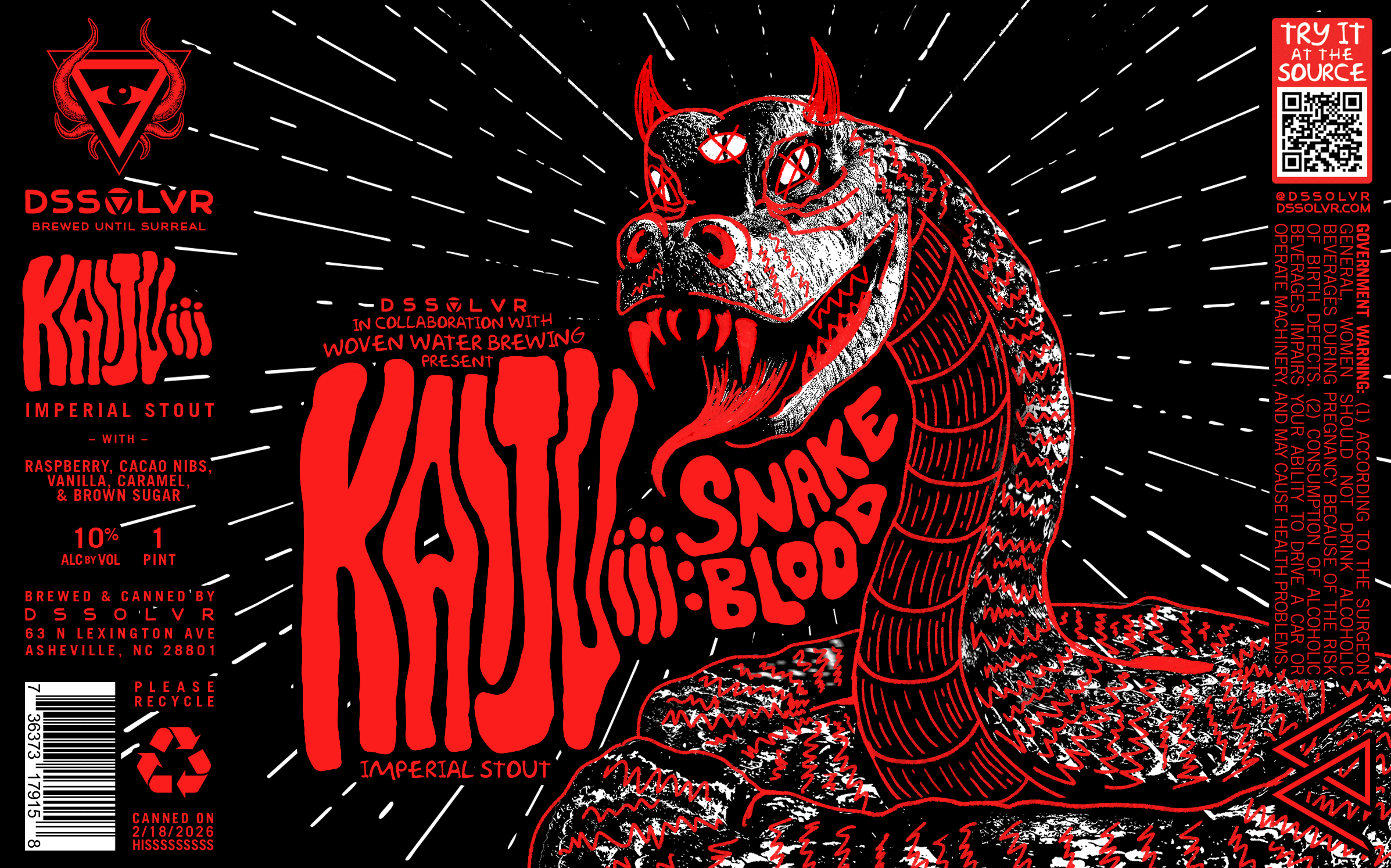 We started off with our Kaiju base, a gigantic and thicc Imperial Stout layered with a bevy of specialty and roasted malts, ran on a continuous boil for over 6 hours, and hit with Brown Sugar in the kettle. We fermented it low and slow, cold-conditioned it for many moons, and then threw it right into the SNAKE BLOOD TREATMENT.
