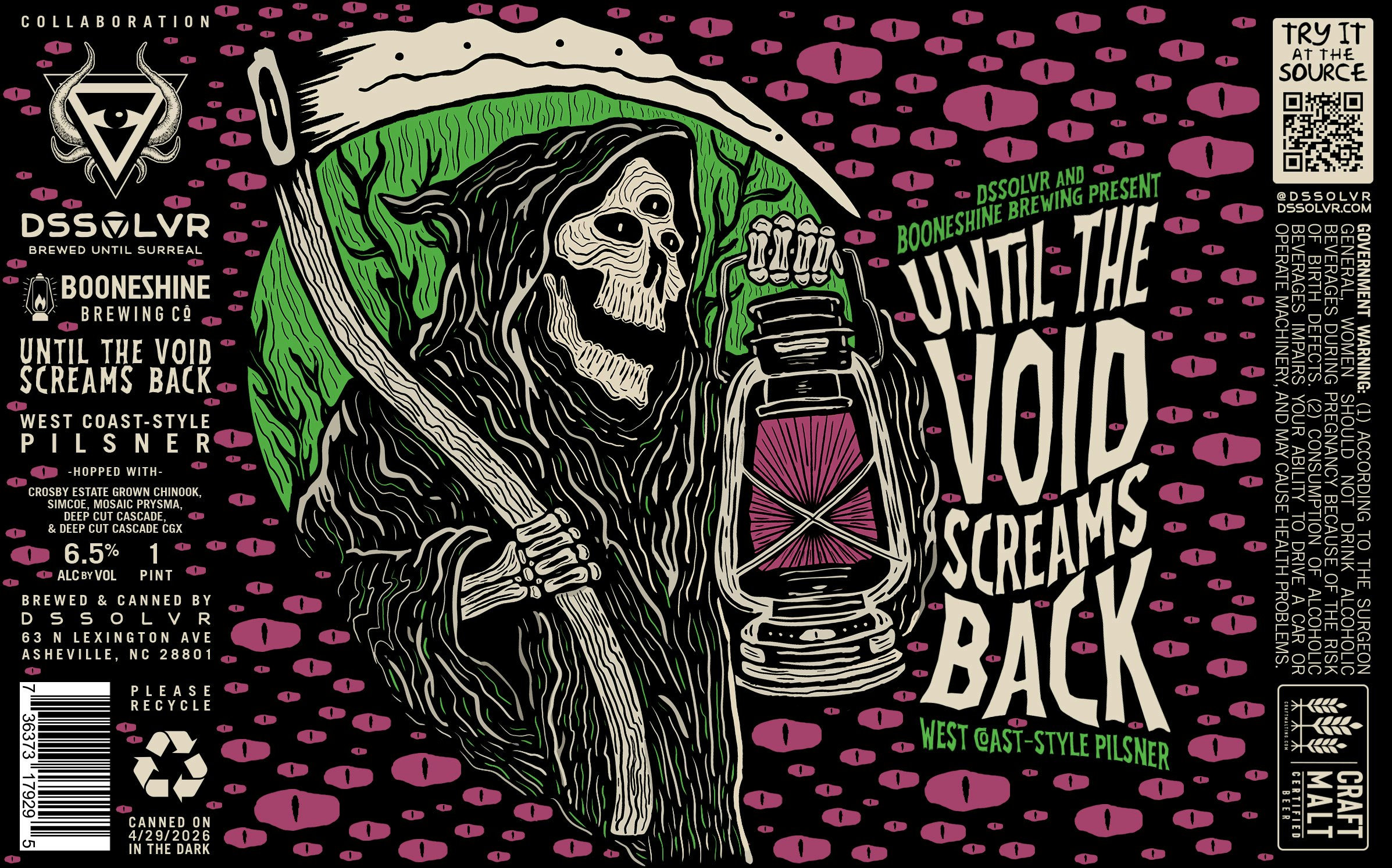 After our last collab with the @booneshinebrewing crew (a dope-ass Hazy IPA called “Screaming Into the Void”), you know we had to have them over to whip up a collab on our turf. It felt super fitting to brew something hoppy, but a little more crispy this time to compliment the Hazy crusher they produced. Obviously, we had to crank out a West Coast Pilsner. And thus, “Until the Void Screams Back” was born.